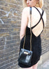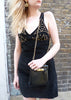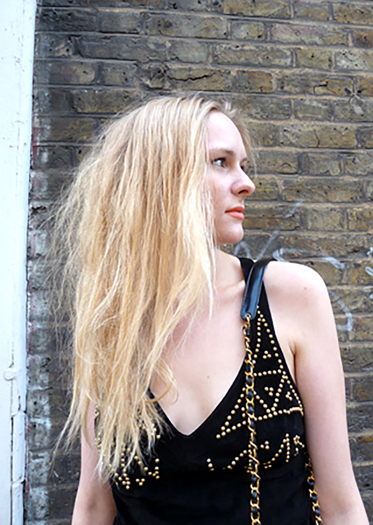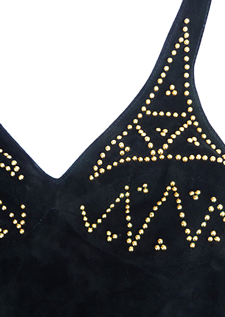 Check out this beautiful, buttery-soft suede mini-dress. The bust area is covered in tiny gold-dot studs, that remind me of those little sugar-ball cake decorations, yum